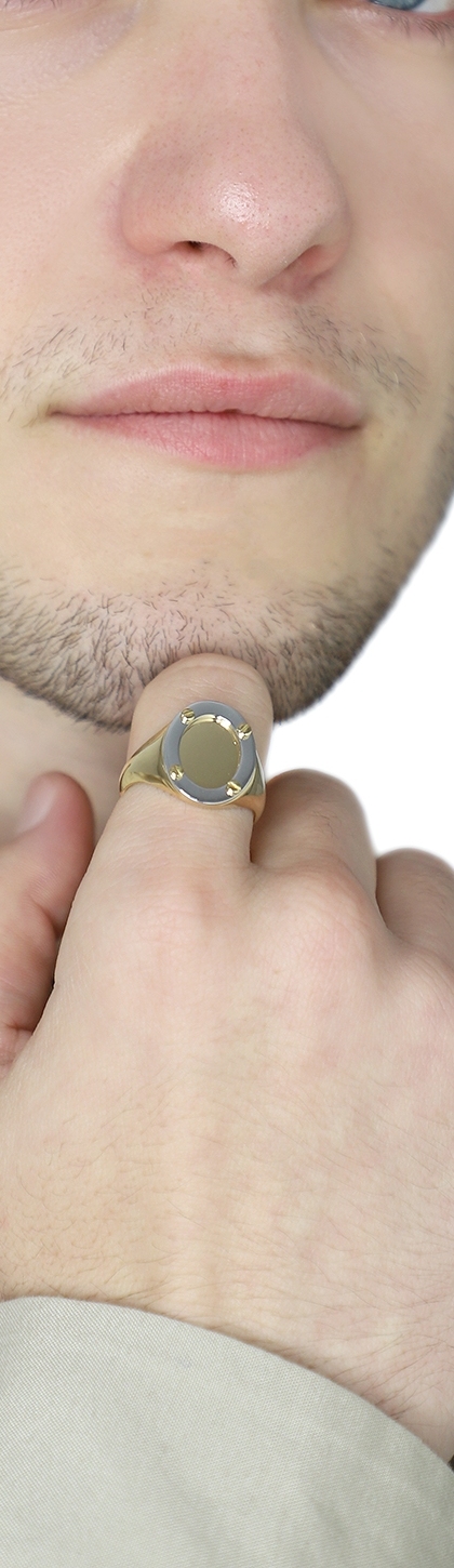 Die kontrastreiche Kombination der beiden Goldtöne verleiht dem Ring eine moderne und zugleich klassische Ausstrahlung. Seine ovale Form unterstreicht den maskulinen Charakter, während die präzise Verarbeitung höchste Handwerkskunstwiderspiegelt.