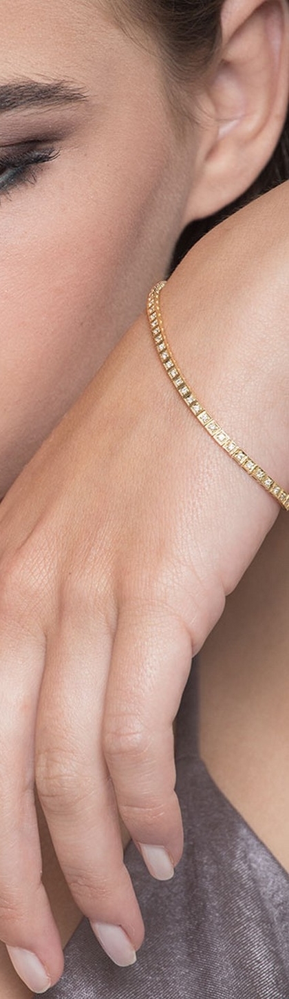 Gelbgold 750 quadratisches Tennisarmband mit natürlichen Diamanten Brillantschliff, Farbe H, Reinheit VS. Gliederbreite ca. 2,60mm. Das Gesamtkarat des Armbands kann je nach gewählter Länge variieren.