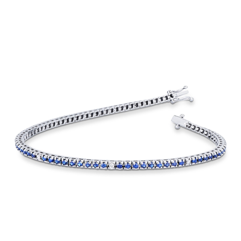 Tennisarmband aus 750er Weißgold mit blauen Saphiren und Diamanten Brillantschliff, Farbe H, Reinheit VS. Das Armband ist etwa 2.25 mm.