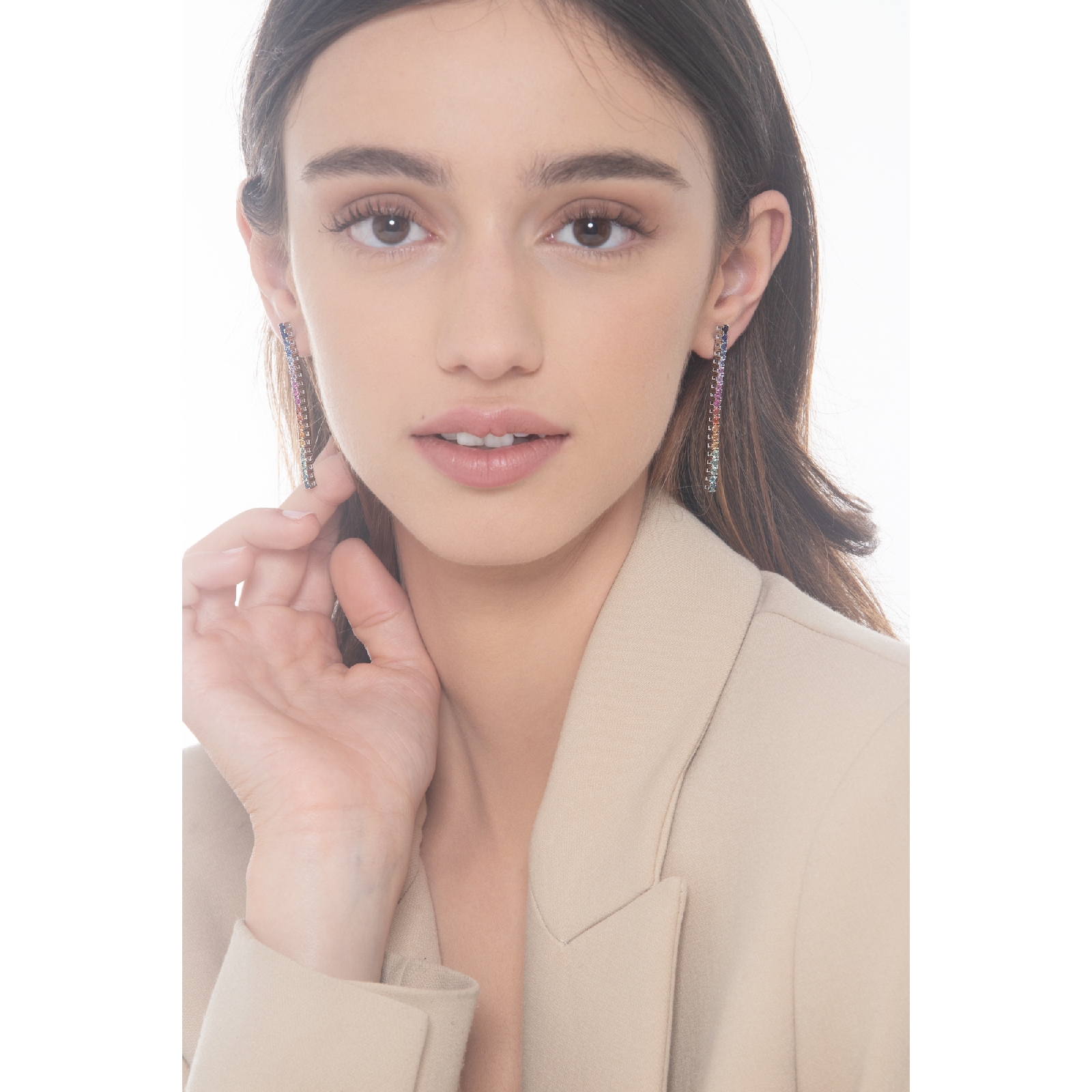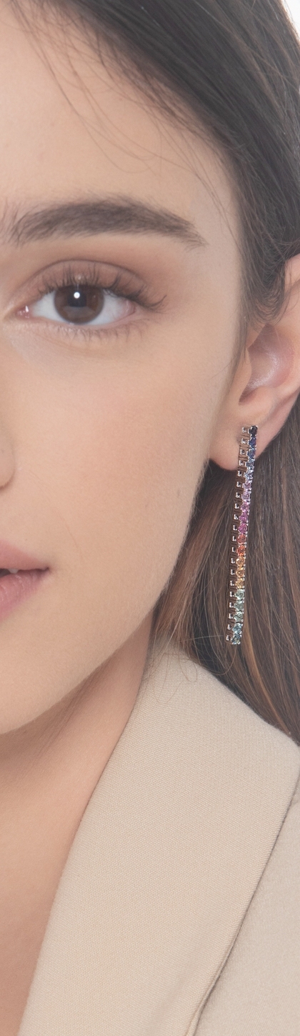 Gefertigt aus hochwertigem 18 Karat Weißgold, präsentieren sich die Ohrhänger im eleganten Tennis-Stil und sind mit je 20 multicolor Saphiren besetzt – präzise gefasst und leuchtend in ihrer Vielfalt.Die Ohrringe sind 5,5 cm lang.
