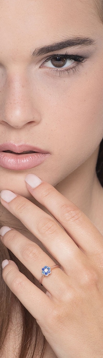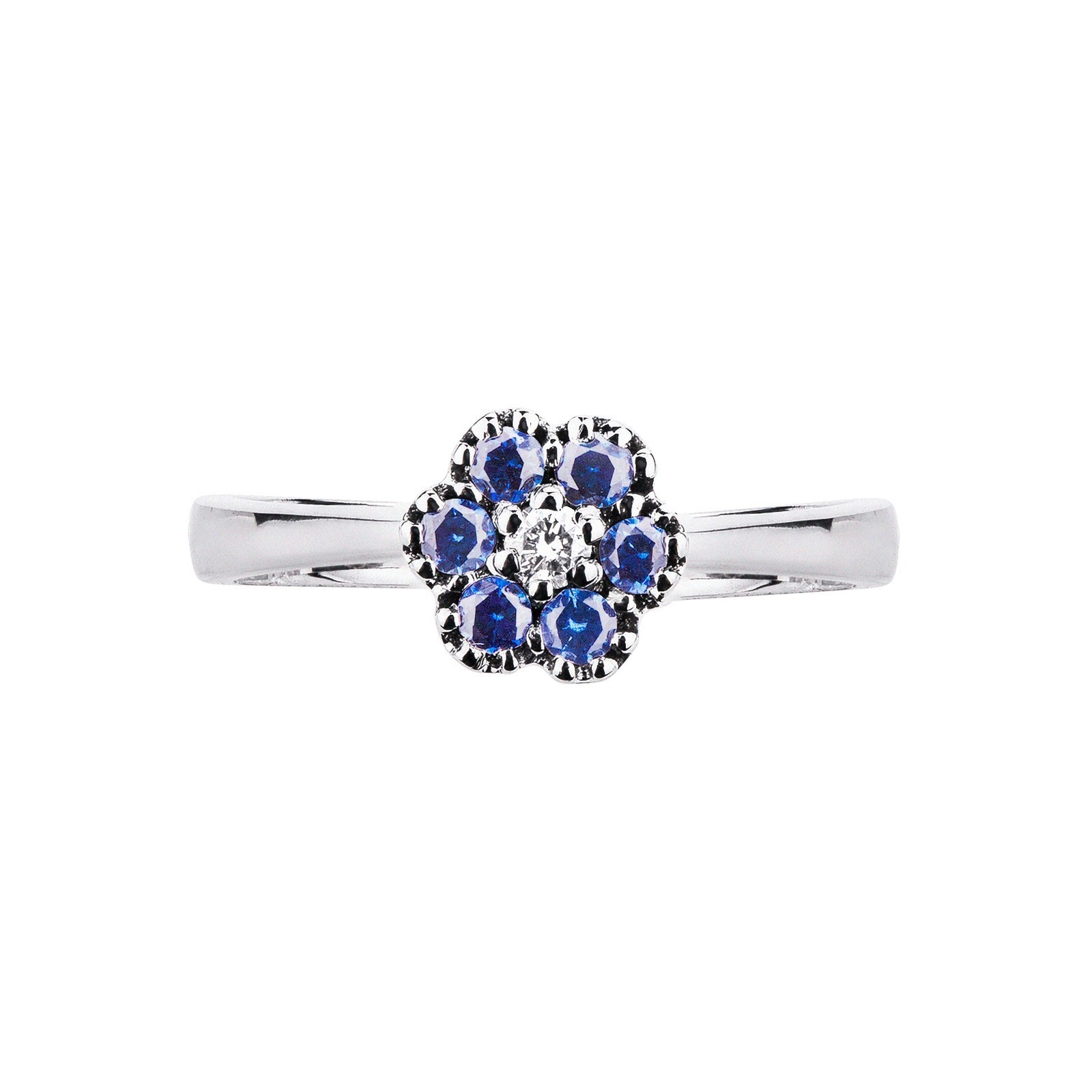 Blumenring aus 18k 750 Weißgold mit Diamanten und blauen Saphiren