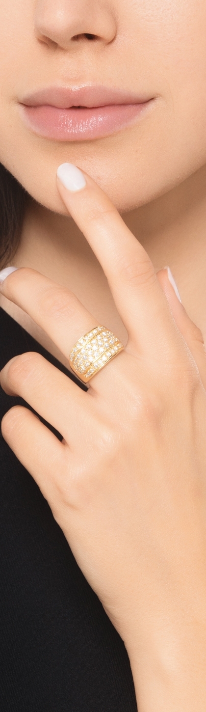 Zeitlose Eleganz trifft auf luxuriöse Handwerkskunst – dieser Bandring aus 18 Karat Gelbgold begeistert mit seiner raffinierten Ausstrahlung. Die Oberfläche ist mit brillantgeschliffenen Diamanten, Farbe H, Reinheit VS besetzt, die das Licht bei jeder Bewegung einfangen und ein faszinierendes Funkeln erzeugen.