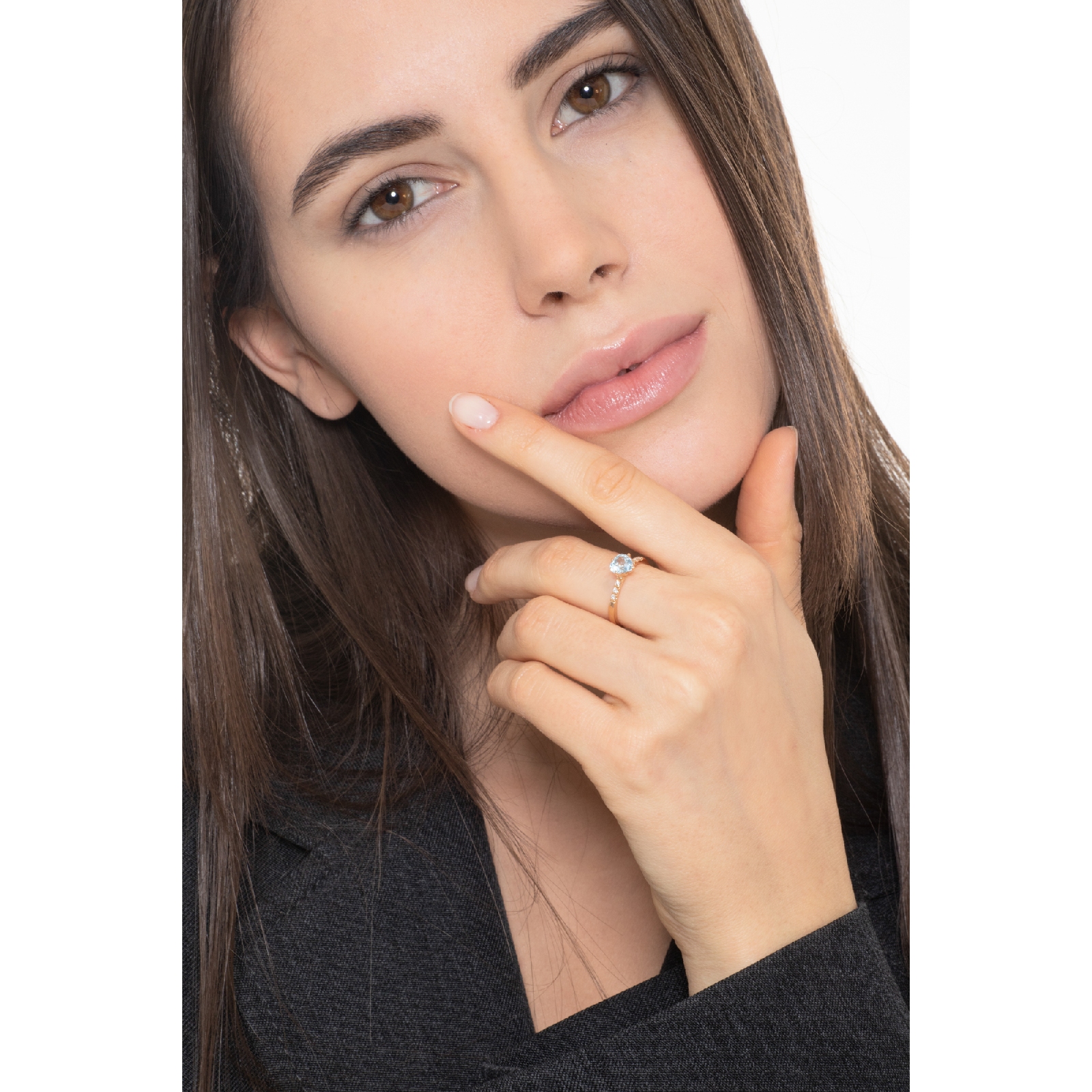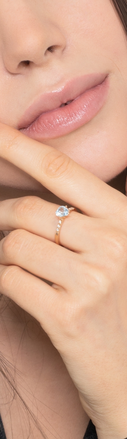 Roségold 18K Ring mit Aquamarin Herzschliff von etwa 5x5 mm und Diamanten Brillantschliff, Farbe H, Reinheit VS auf der Ringschiene.