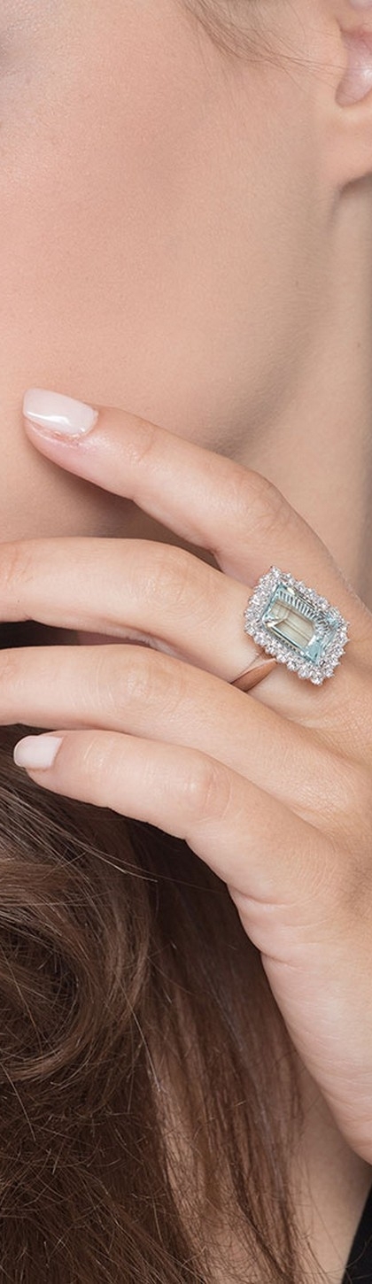 Halo Ring aus Weißgold 18k mit Aquamarin und Diamanten