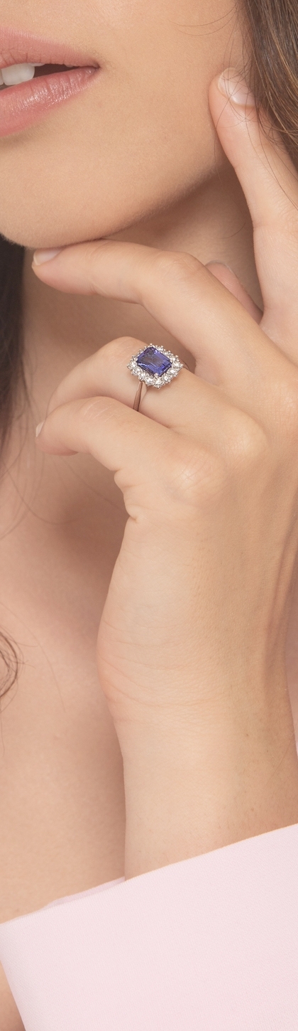 Tansanit Ring mit 14 Diamanten 18k Weißgold 750