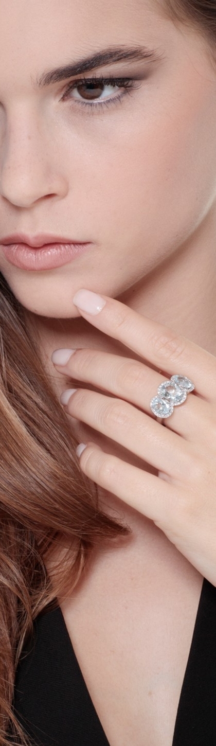 Trilogie Ring aus Weißgold mit Aquamarinen und Diamanten