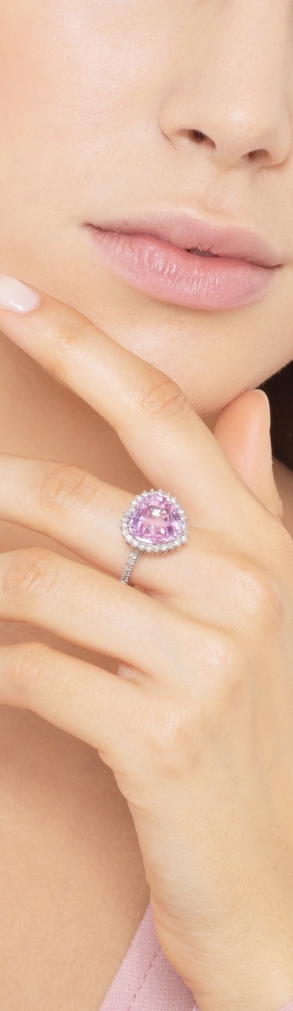 Verlobungsring Weißgold mit Diamanten und rosa Saphir im Herzschliff