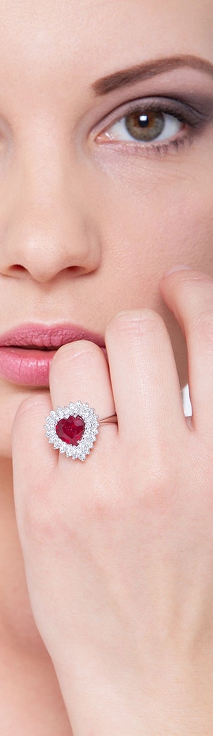 Weißgold Ring mit einem Rubin in Herzform und Diamanten