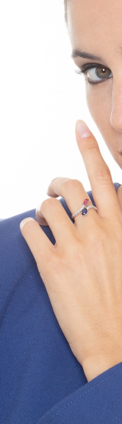 Weißgoldring mit Diamanten, rotem Rubin und blauem Saphir