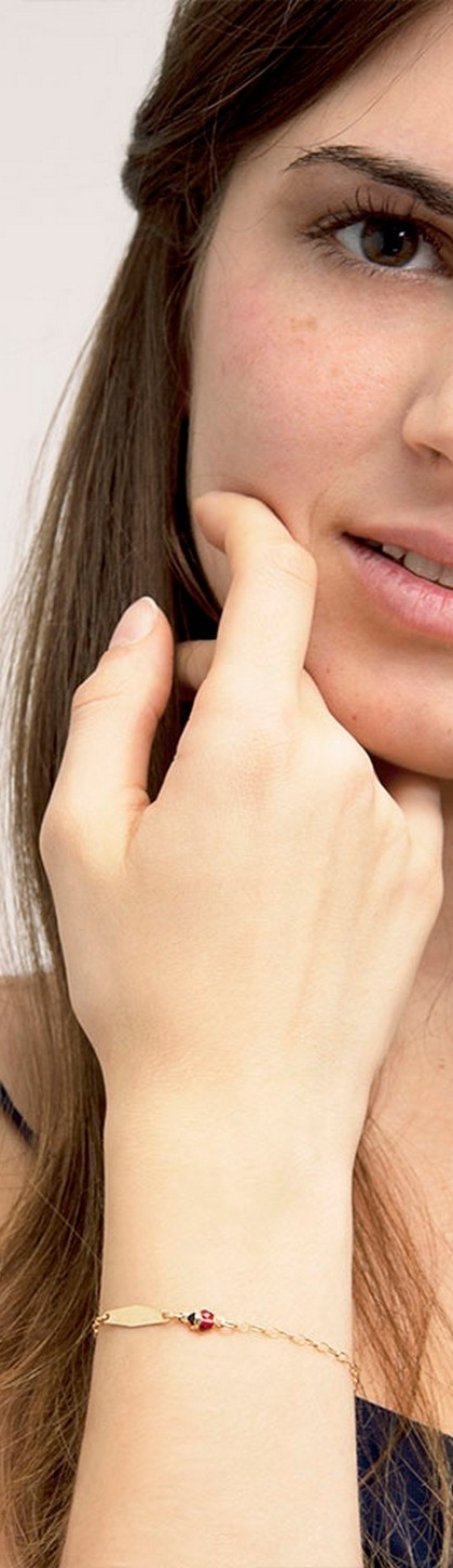 Armband aus 18 Karat Gelbgold mit Marienkäfern und Gravurplatte
