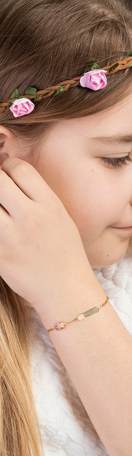 Kinderarmband Mädchen mit Gravurplatte und kleinem Bären aus 750er Gelbgold