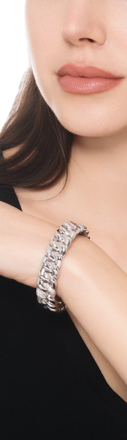 Das markante Design der massiven Glieder trifft auf die filigrane Eleganz eines funkelnden Pavé von Diamanten im Brillantschliff, Farbe G, Reinheit VS das dezent in die Schließe integriert ist.