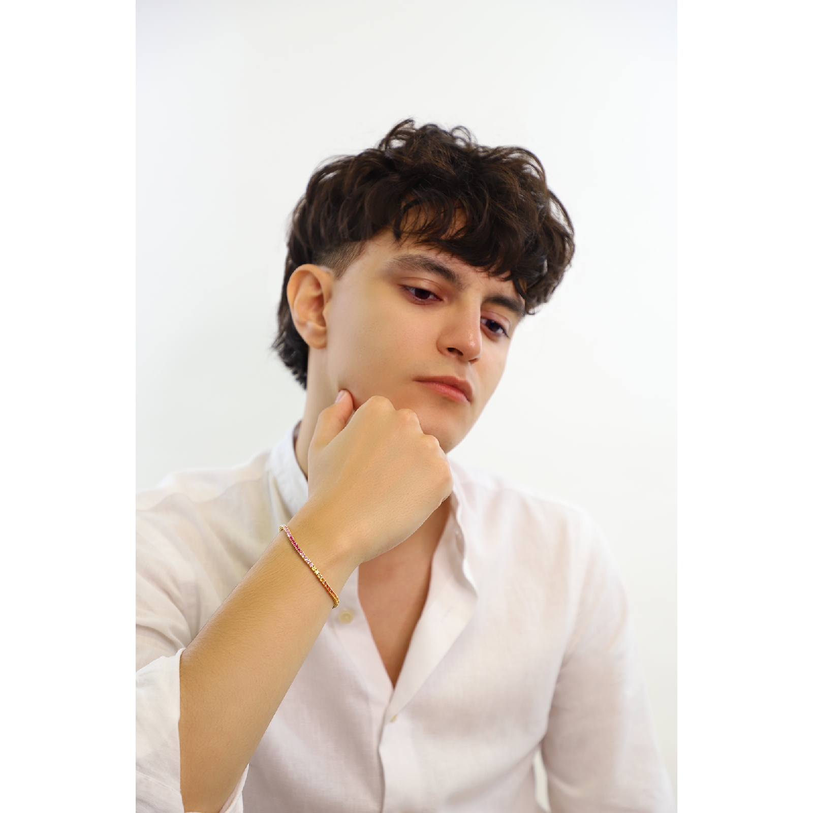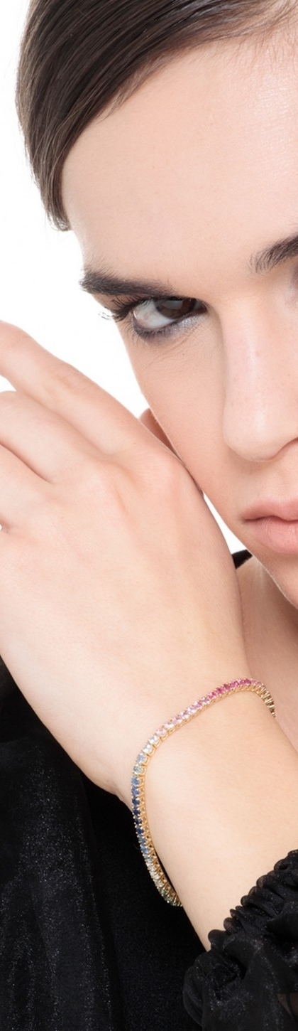 Die funkelnden Saphire in leuchtenden Farben – von klassischem Blau über Rosa, Gelb, Grün bis hin zu Violett – symbolisieren Lebensfreude und Individualität. Das Armband schmiegt sich elegant um das Handgelenk und lässt sich sowohl im Alltag als auch zu festlichen Anlässen stilvoll kombinieren.