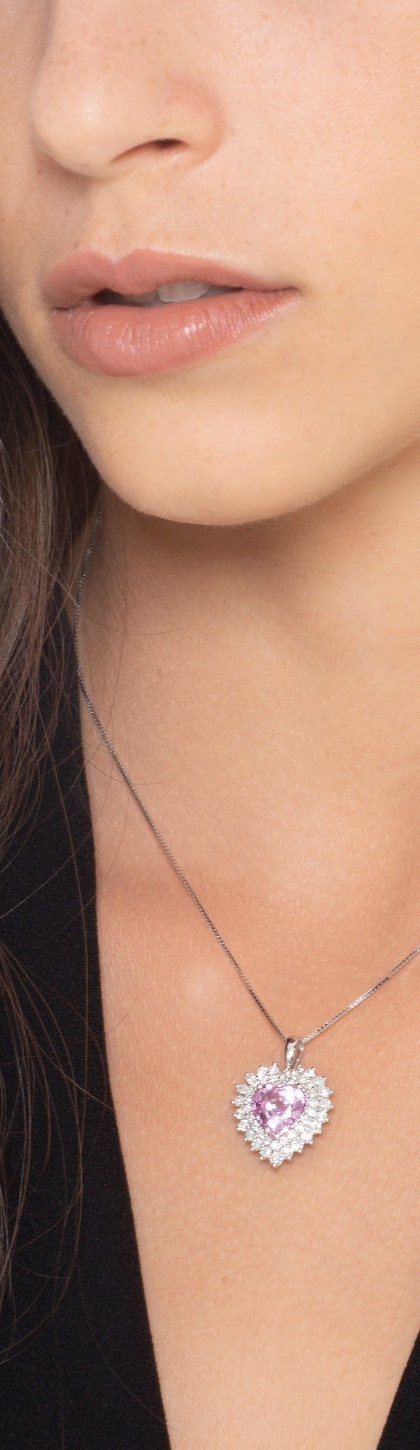 Herzkette Halo aus 18K Weißgold mit Diamanten und rosa Saphir