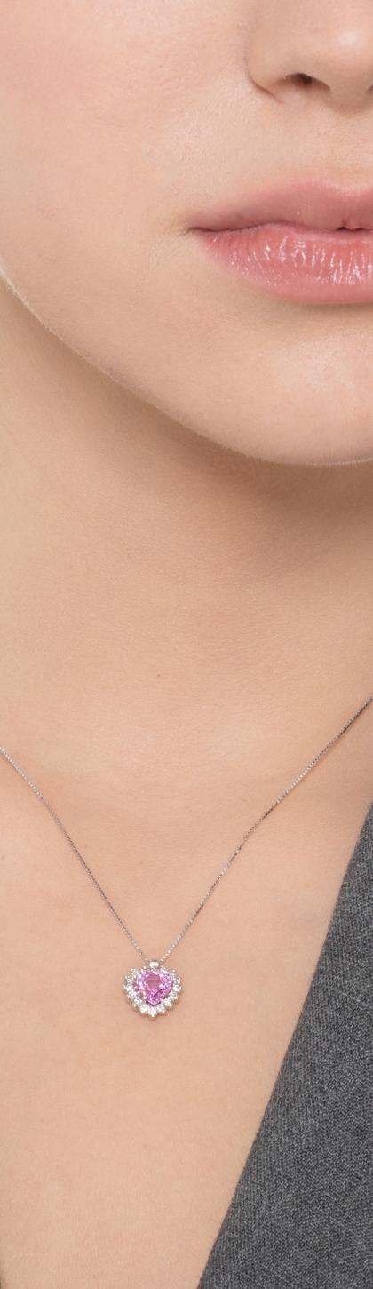 Weißgold Kette mit Herzanhänger aus Saphir rosa und Diamanten