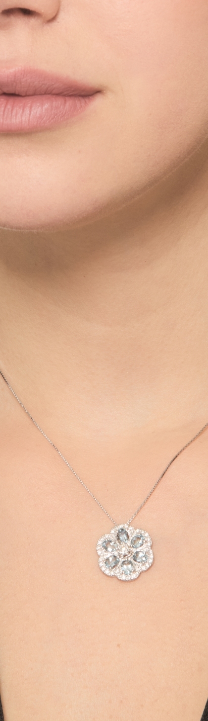Kette Damen aus Weißgold mit Blumenhänger aus Aquamarin und Diamanten